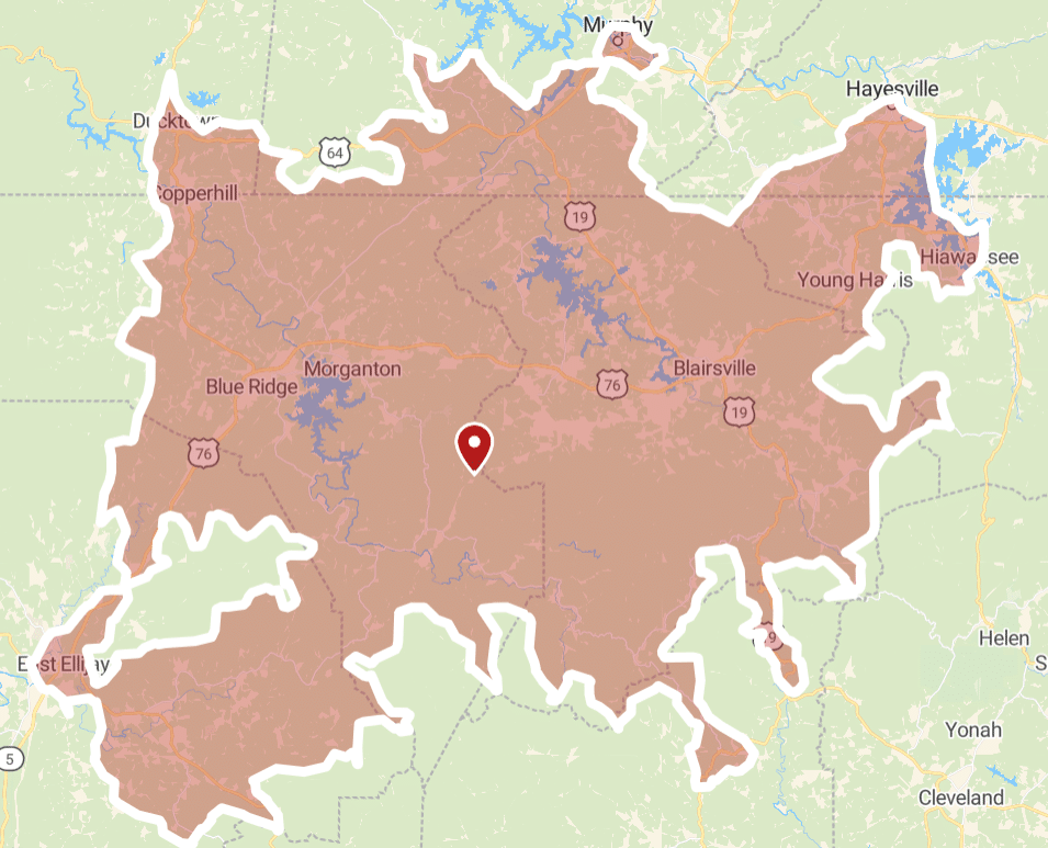 Blairsville, Blue Ridge, Suches, Cherry Log, East Ellijay, Young Harris, Hiawassee, Morganton, Copper Hill, McCaysville, Ducktown, Mineral Bluff, Murphy, Hayesville.